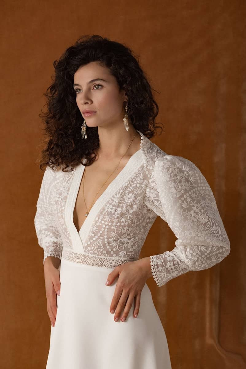 Laissez-vous séduire par Agatha, une robe de mariée bohème au charme discret et poétique. Créée dans notre atelier français, elle incarne l’équilibre parfait entre élégance naturelle, dentelle délicate et légèreté fluide. Conçue pour les mariées en quête d’authenticité et de confort, Agatha sublime toutes les silhouettes avec douceur.
