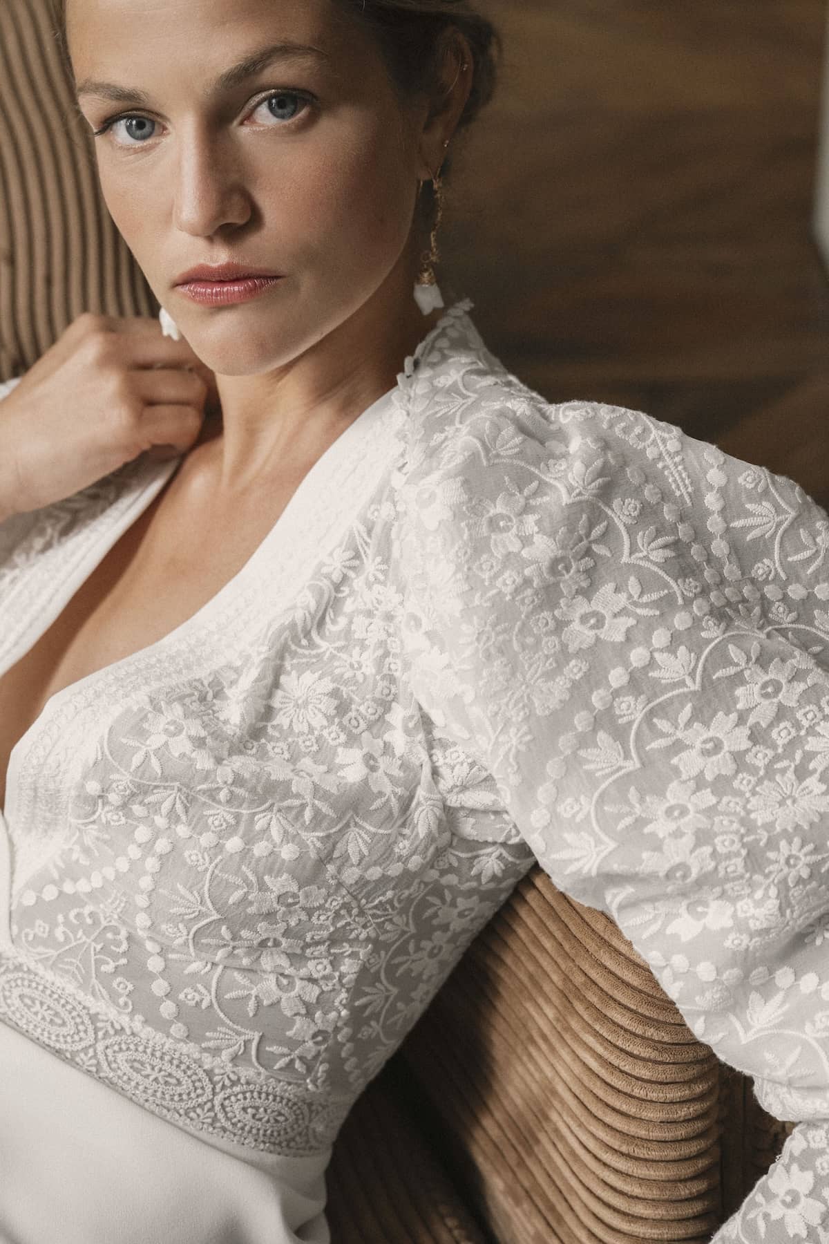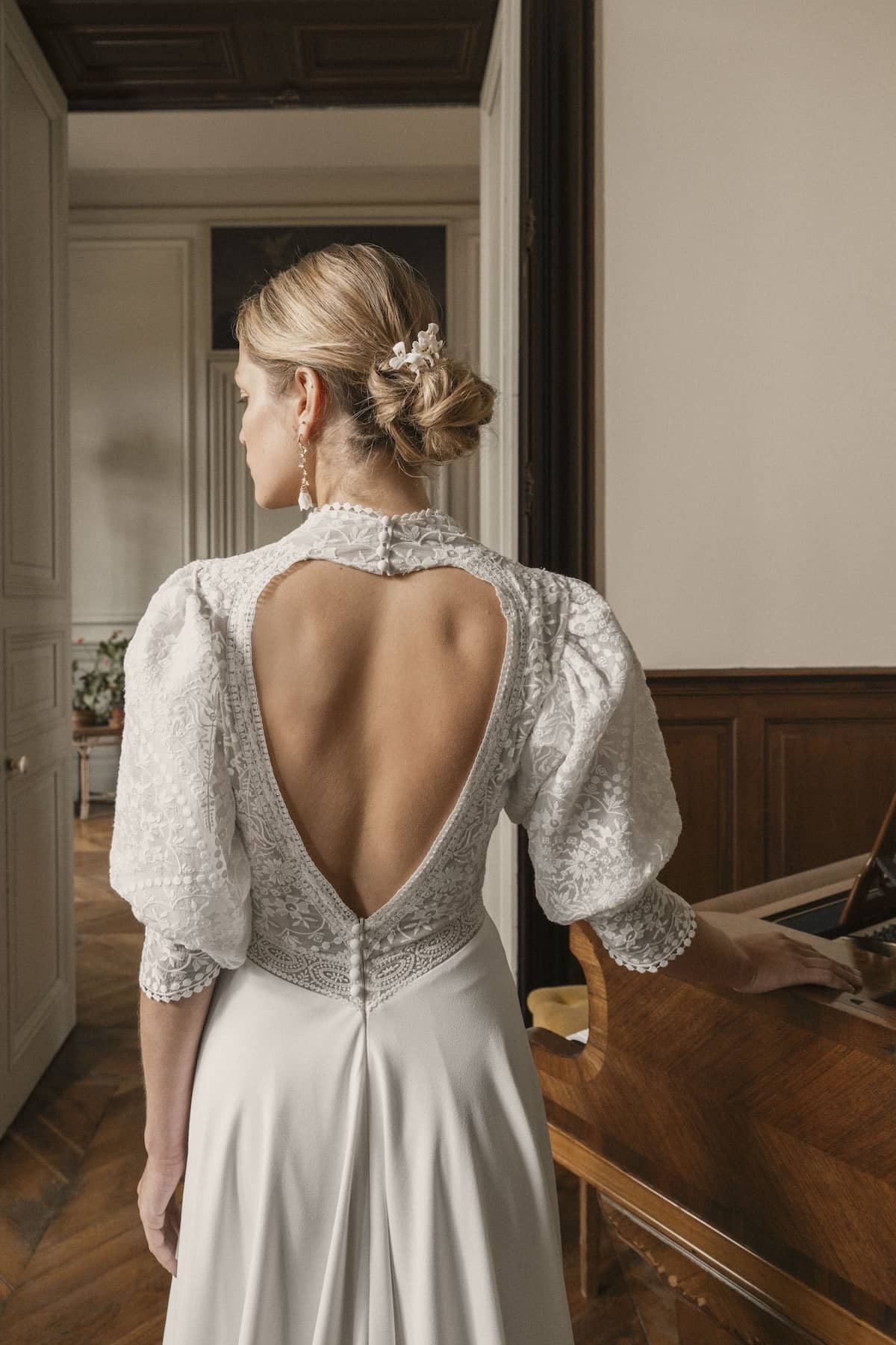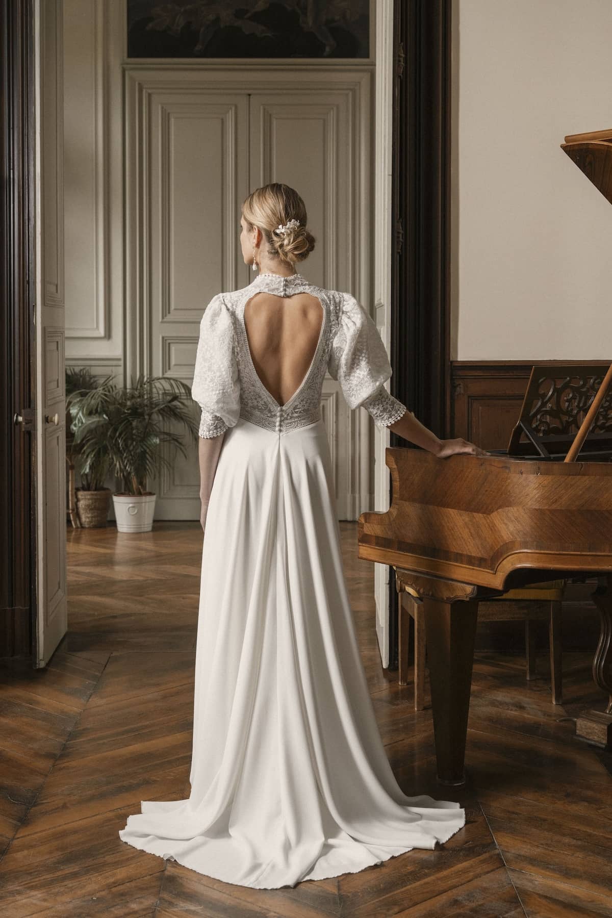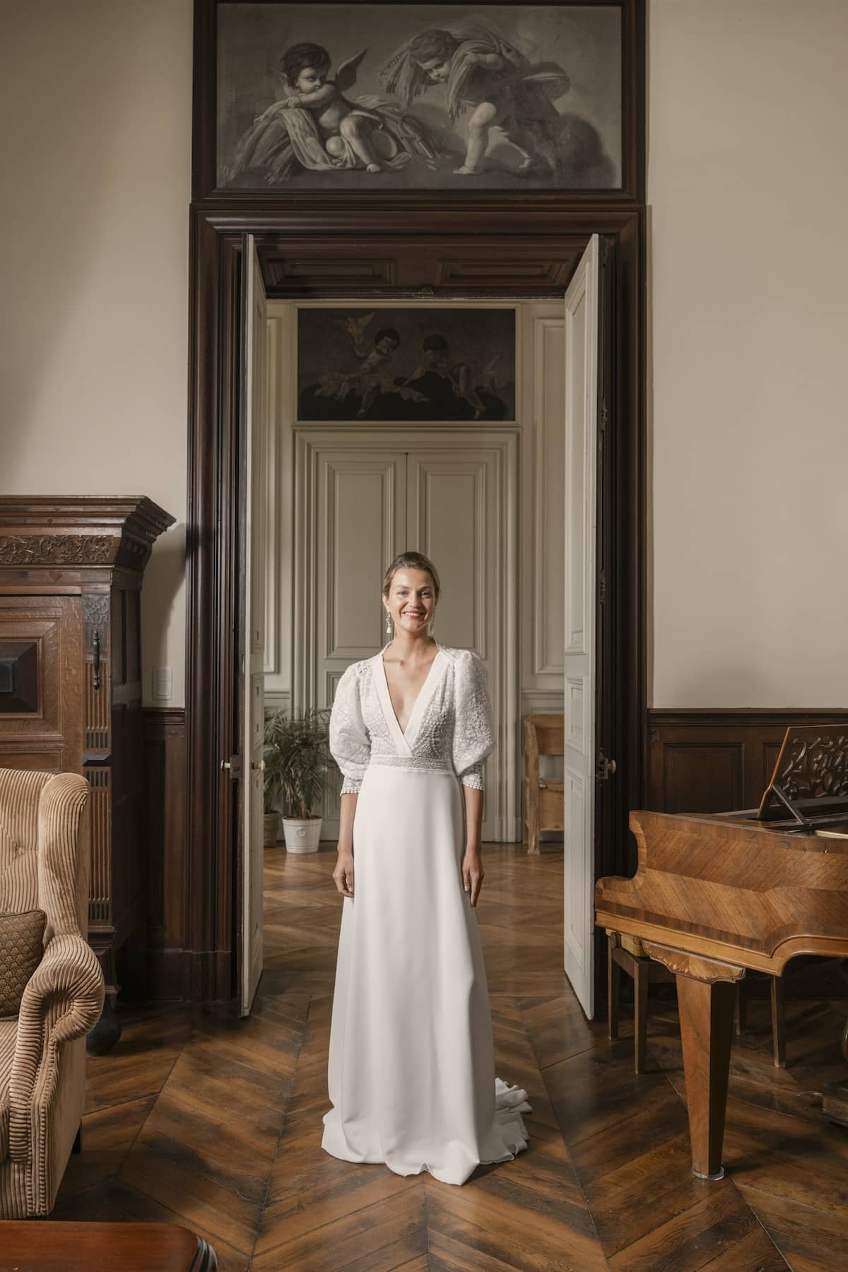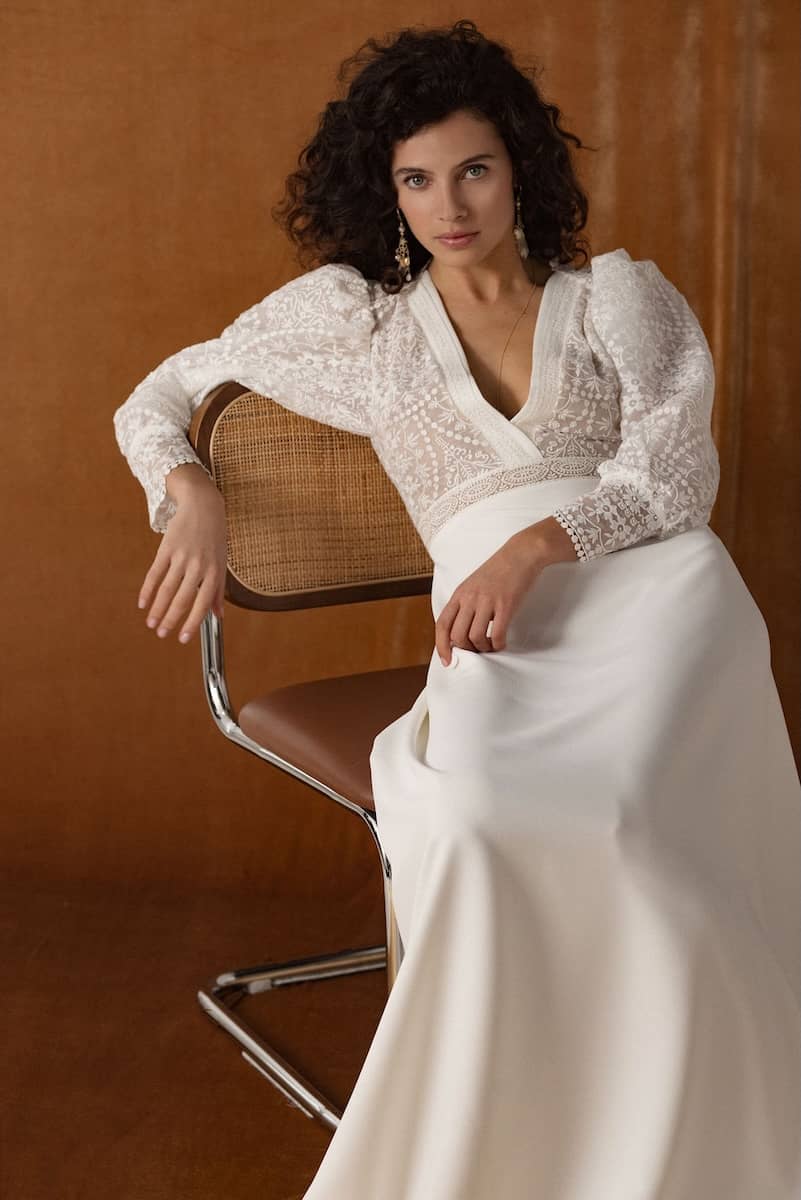 Agatha est idéale pour une cérémonie en extérieur, un mariage champêtre ou bohème chic, pieds nus dans l’herbe ou sandales en cuir naturel. Elle s’adresse aux mariées modernes qui veulent une robe douce, aérienne, et pleine de poésie, sans sacrifier l’élégance.