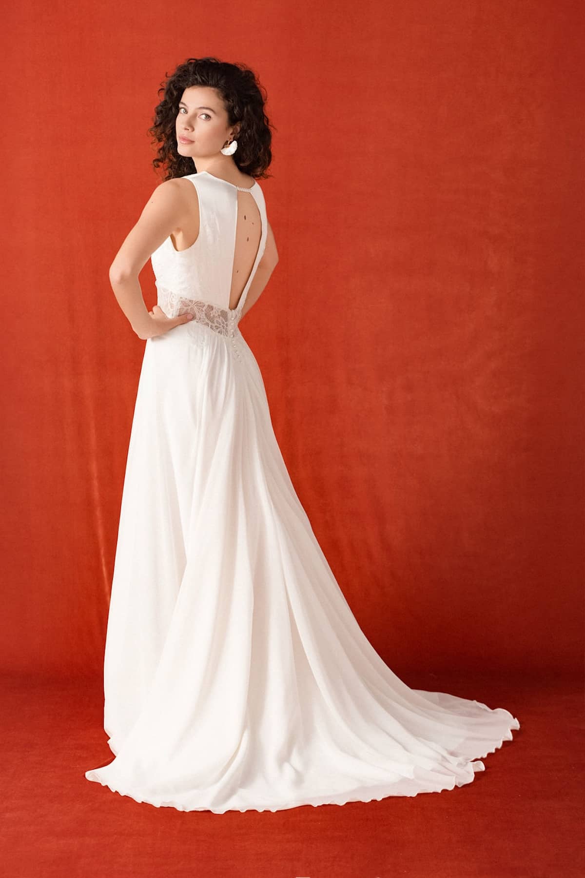 Le haut mettra en valeur votre décolleté avec ce satin très léger, il dessine la taille avec de la dentelle épaisse et le dos à demi fermé est original. La jupe est plissée avec une mousseline recyclée idéale pour celles qui veulent des matières fluides et légères. Il est facile de personnaliser votre robe chez Elsa Gary ! Vous aimez ce modèle mais vous voulez des manches longues ?