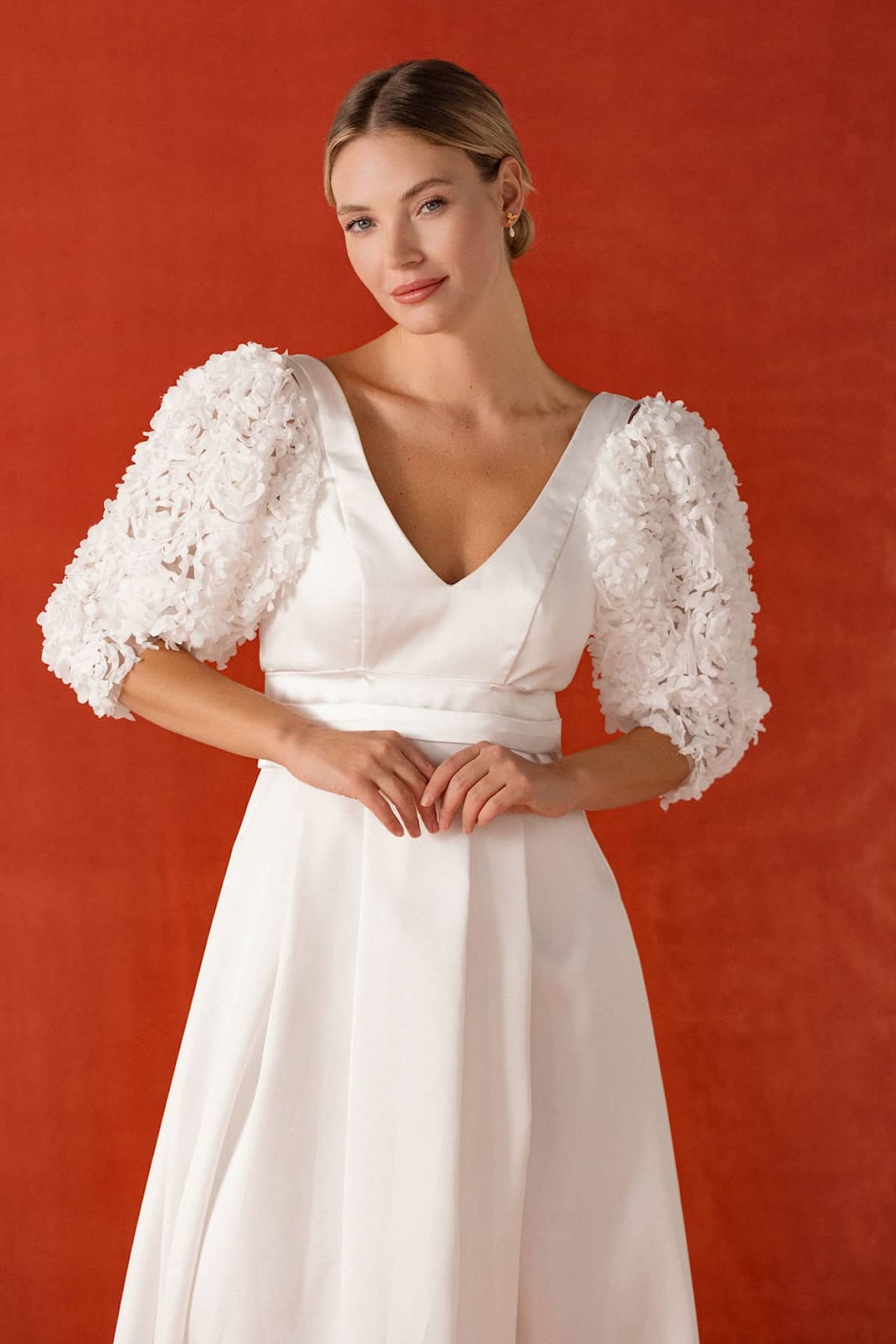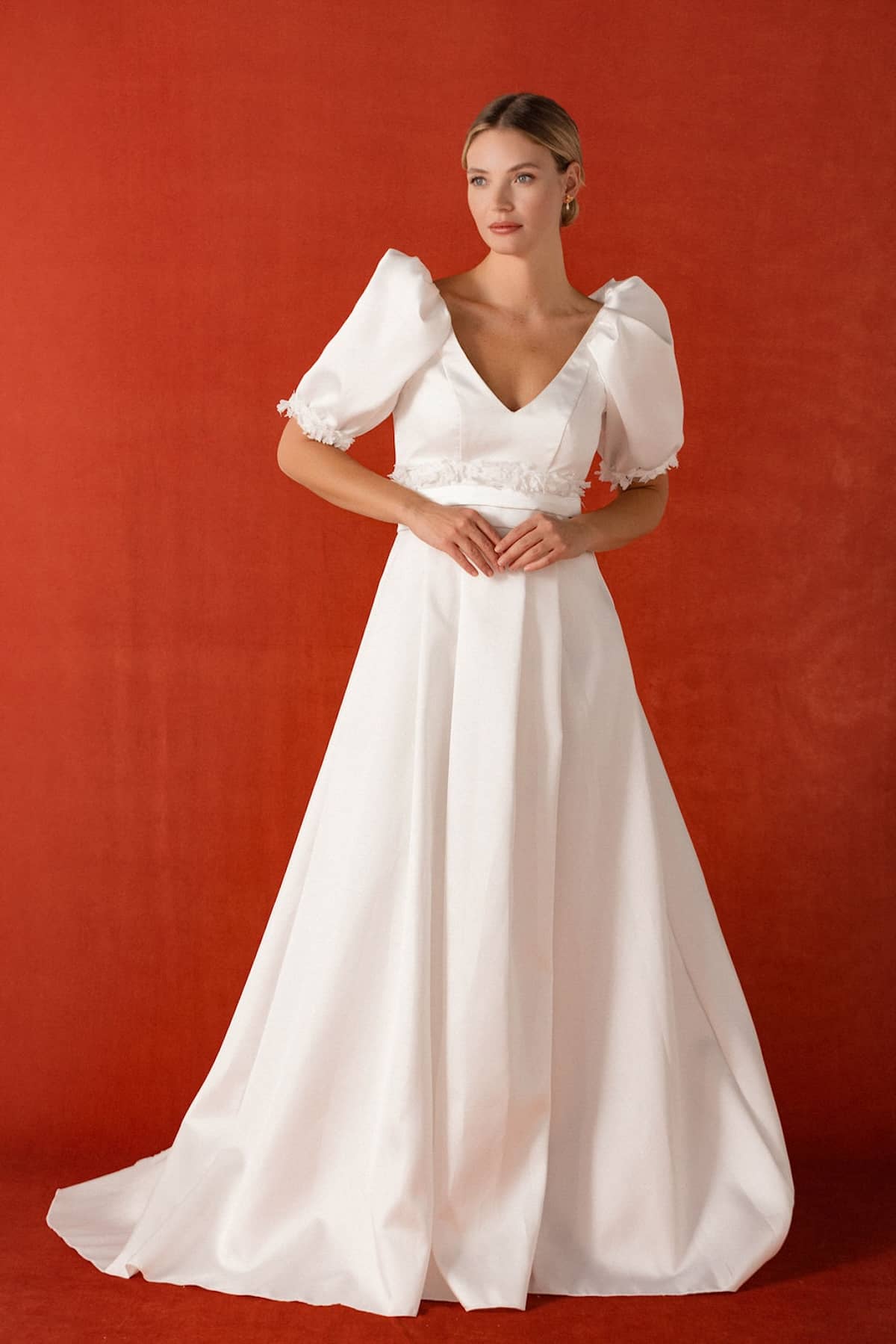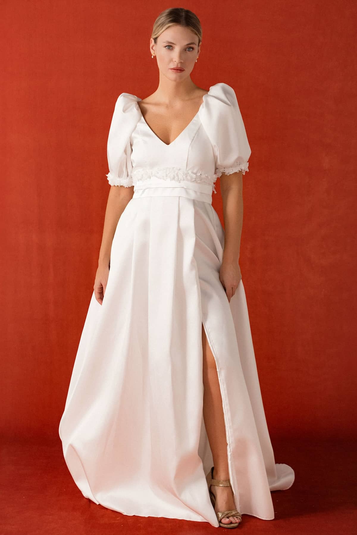 Elle a un côté très couture et sophistiqué. En mikado, les manches volumineuses donnent du caractère à ce modèle. Ajusté parfaitement sous la poitrine avec une ceinture à plis et fendue, vous craquerez pour cette robe.