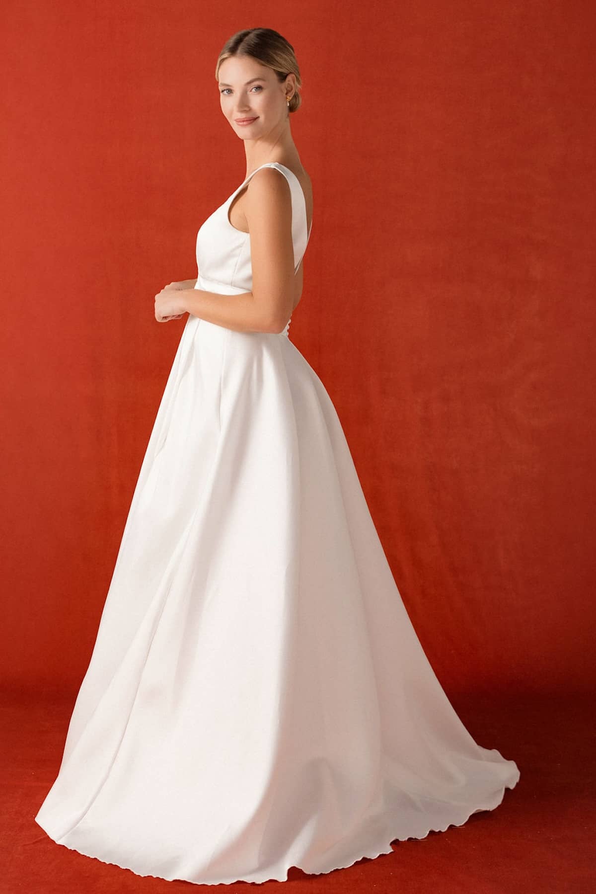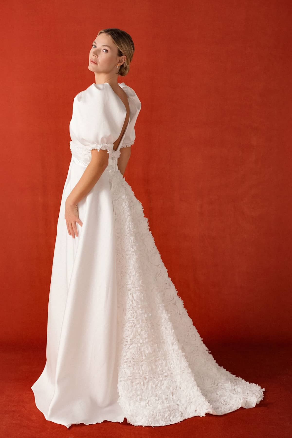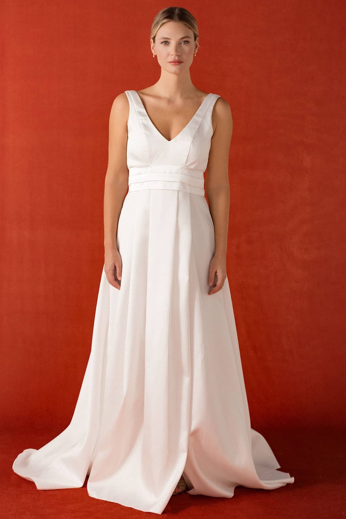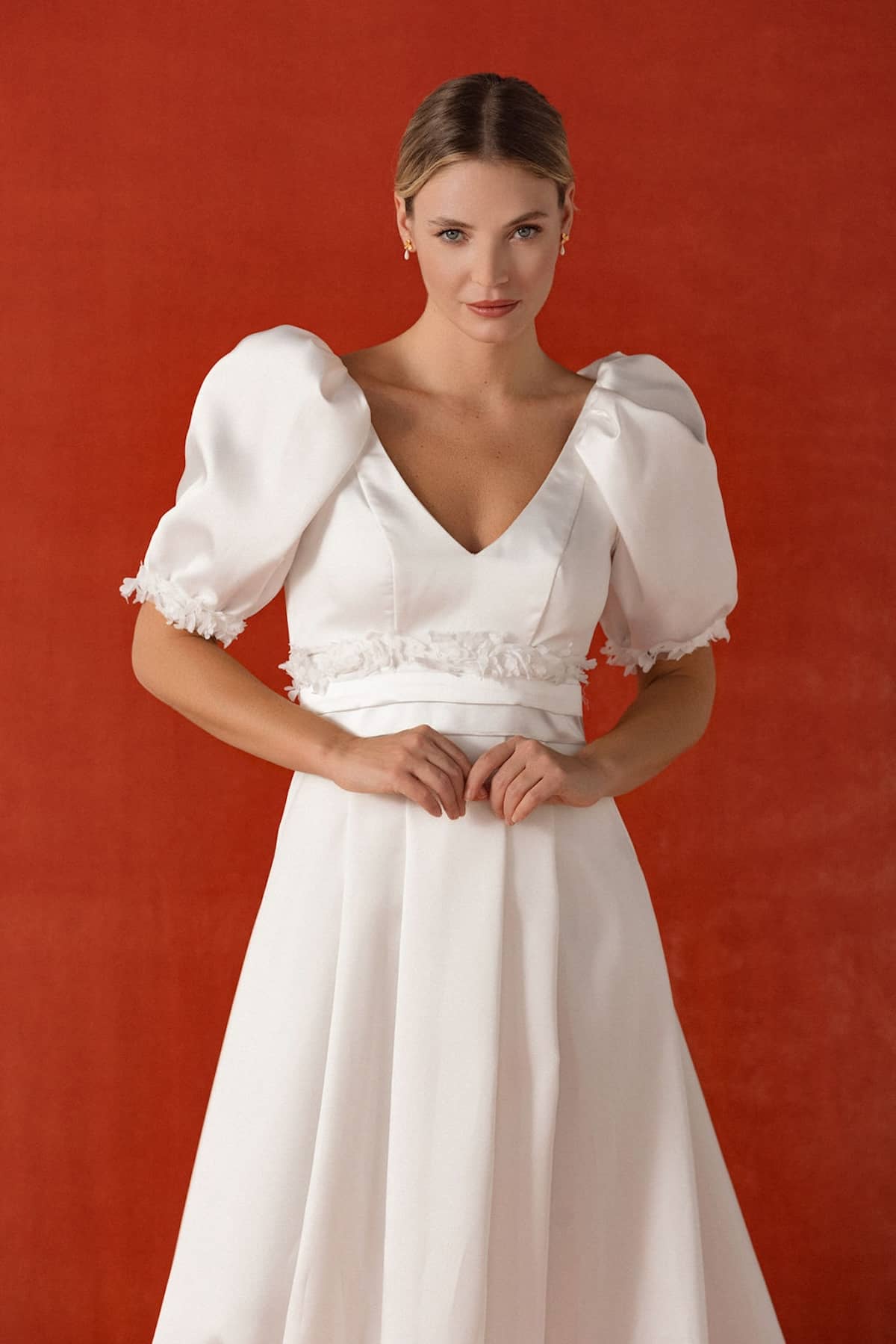 Elle a un côté très couture et sophistiqué. En mikado, les manches volumineuses donnent du caractère à ce modèle. Ajusté parfaitement sous la poitrine avec une ceinture à plis et fendue, vous craquerez pour cette robe.